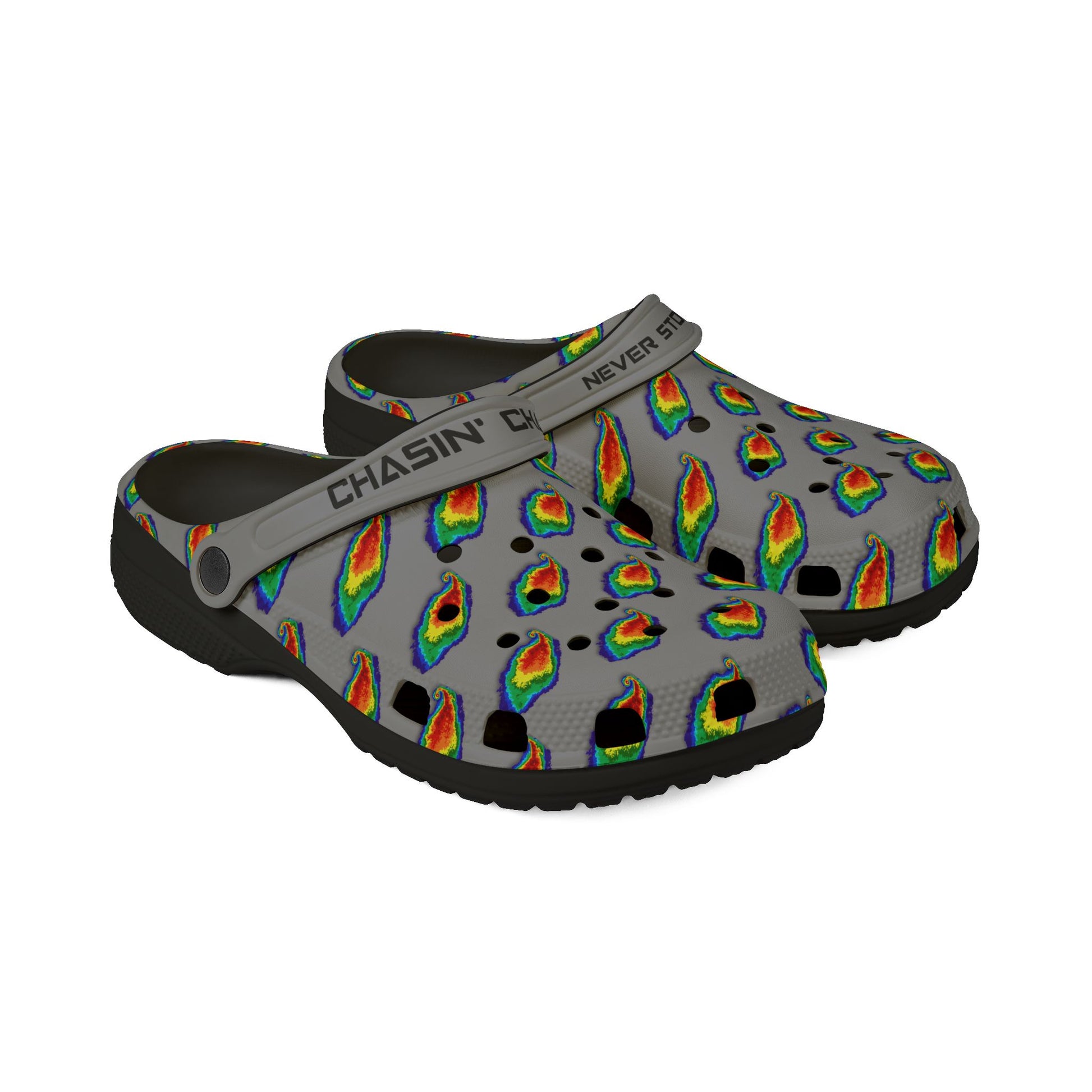Chasin' Chaos Supercell EVA Foam Rubber Shoes are trendy, lightweight clogs with a unique printed design inspired by the EF-5 tornado on April 27 in Tuscaloosa, AL. They offer great comfort and anti-slip performance, perfect for indoor and outdoor wearing. Ideal for those who love unique, eye-catching footwear. Relevant for storm chasers, weather enthusiasts, and those looking to make a statement with their shoes. Perfect for storm season and weather-related events.
